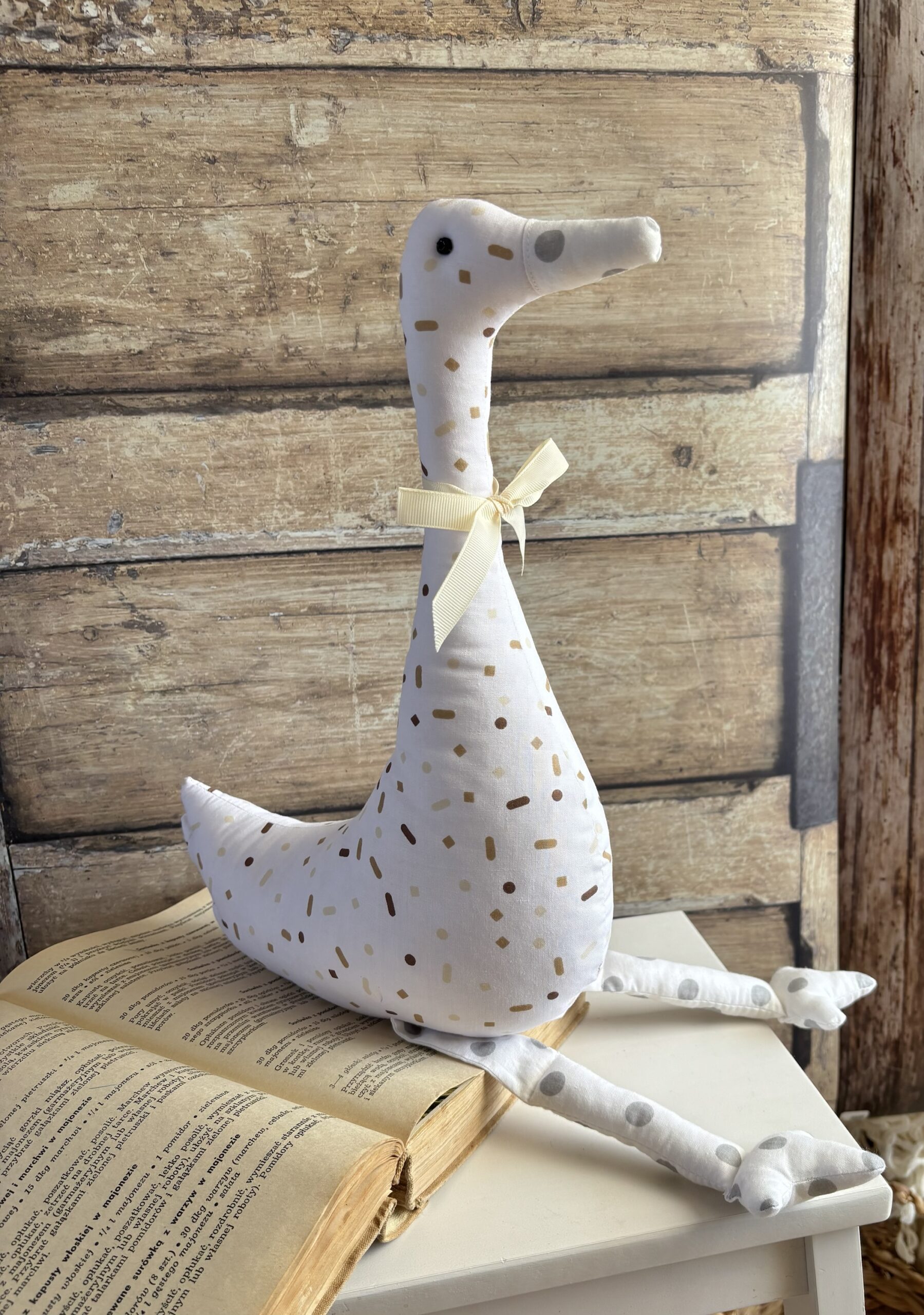Wykonana w 100% z bawełny, wypełniona antyalergiczną kulką silikonową. Nie ma ostrych elementów. Gęś może siedzieć sama. Dzika gęś ma oczy wykonane z drewnianych koralików.